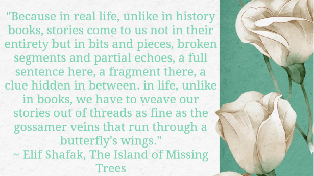“Because in real life, unlike in history books, stories come to us not in their entirety but in bits and pieces, broken segments and partial echoes, a full sentence here, a fragment there, a clue hidden in between. In life, unlike in books, we have to weave our stories out of threads as fine as the gossamer veins that run through a butterfly’s wings.”