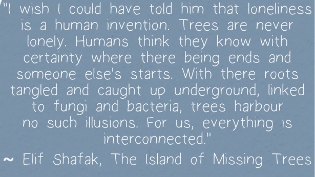 “I wish I could have told him that loneliness is a human invention. Trees are never lonely. Humans think they know with certainty where their being ends and someone else’s starts. With their roots tangled and cuaght up underground, linked to fungi and bacteria, trees harbour no such illusions. For us, everything is interconnected.”